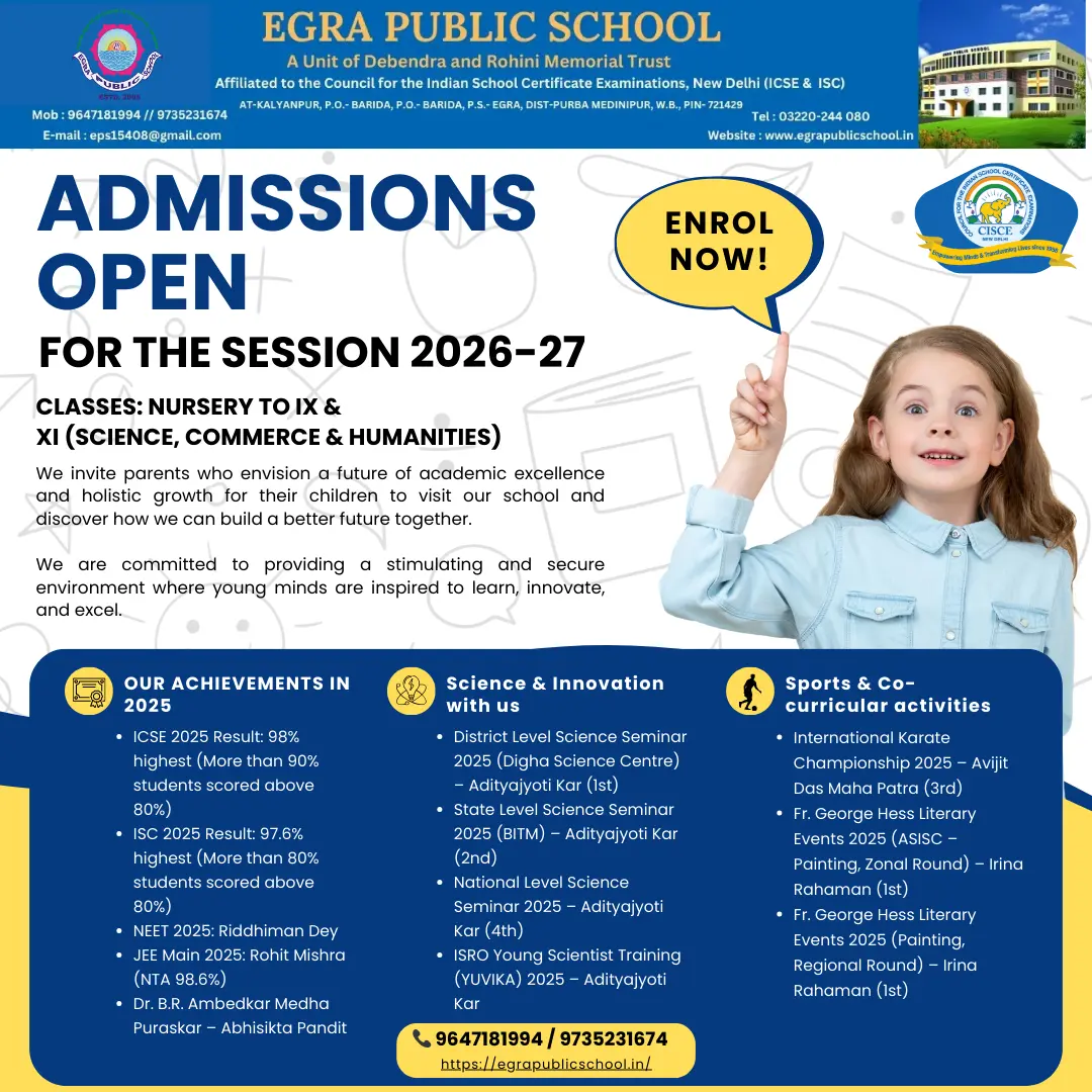 Egra Public School extends an warm appreciation to all the parents and guardians, well wishers, friends and all the concerned persons thinking about the education of their tiny tots, on the eve of affiliating to C.I.S.C.E. Now take benefit of having an affiliated English Medium School in Egra Sub-Division at your doorstep to secure your child’s future.